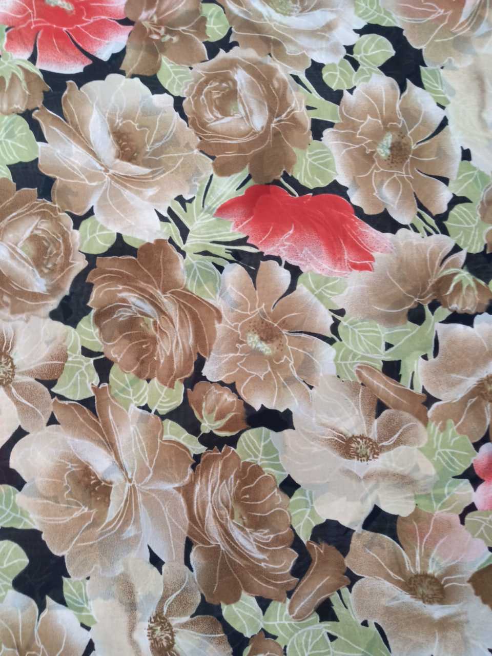 kahve Büyük Güller Şifon, altı astarlı elbise kumaşı olarak kullanılan, kaliteli, yumuşak ve şık kumaş türüdür. Elbise ve bluz üretiminde çok önemli yer tutan şifon, hafif ve ışık geçiren yapıdadır.Fular ve şal olarak tercih edilmektedir.