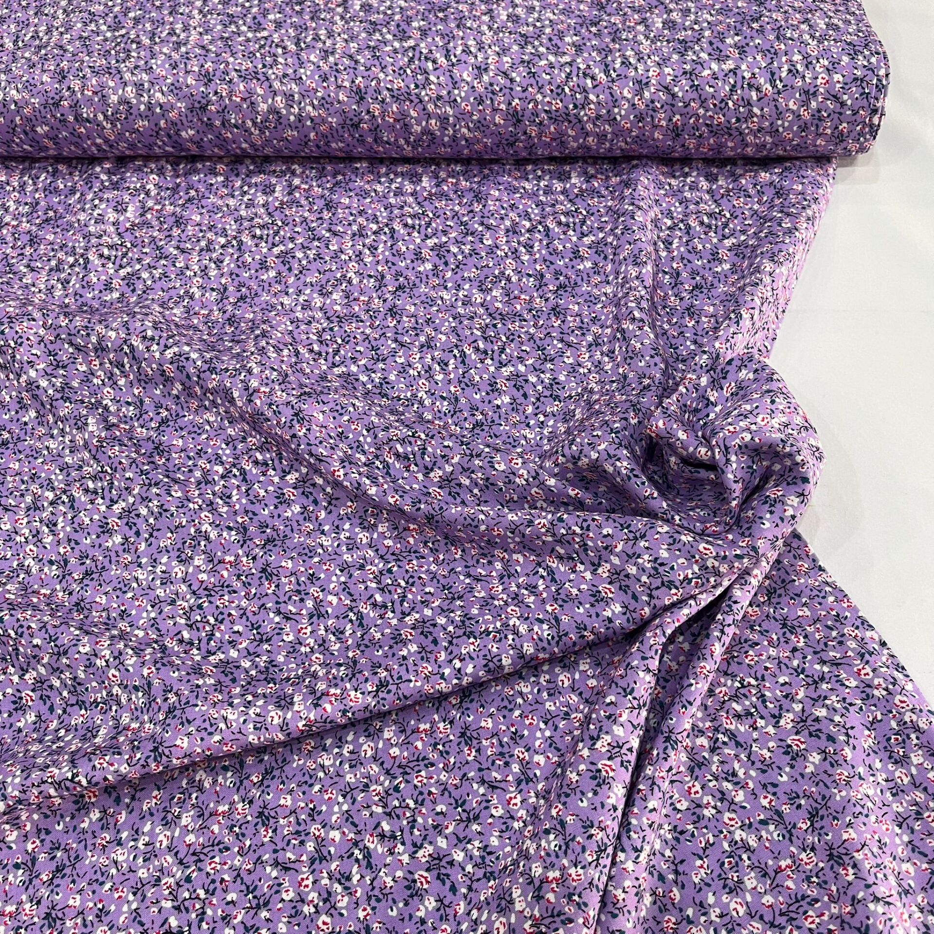 Lila Minik Çiçek Bahçesi Viskon Kumaş,elbise yapımı için uygun, ancak şalvar ve pijama gibi rahat kıyafetler de dikilen kumaştır. Gömlek ve bluz yapımı için de bu viskon kumaşın tercih edildiği bilinmektedir.Pamuklu olması sebebiyle terletme yapmaz.Yazlık elbisesi veya plaj elbisesi dikmek ve diktirmek isteyenler için ideal bir kumaştır.