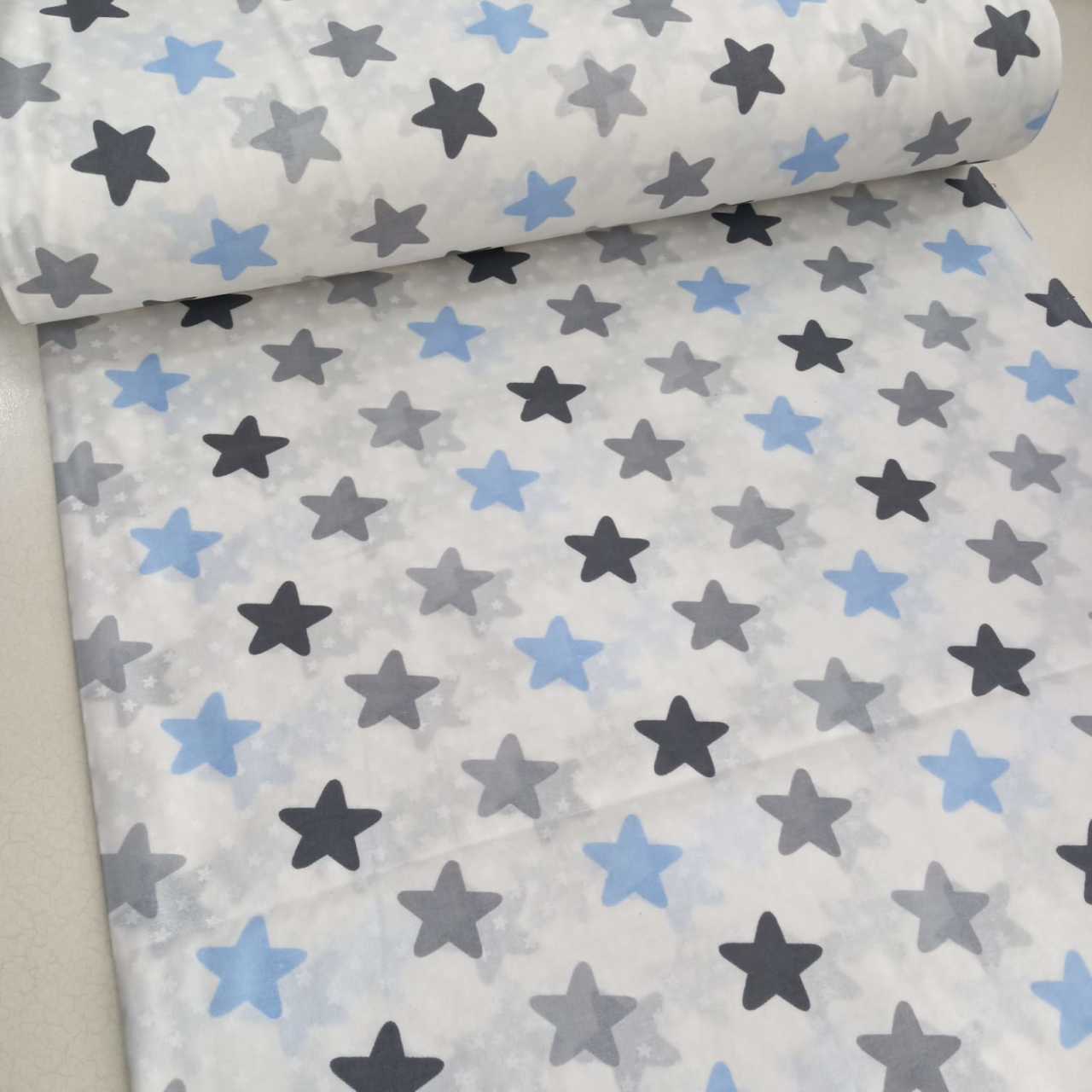 Mavi Gri Yıldızlar Poplin pamuklu yapısıyla bebek ürünlerinde kullanılabilir. Poplin Kumaş nevresim takımı olarak kullanılabilir. Desenli Poplin kumaş renk ve modelleri. Poplin kumaş terleme yapmaz.