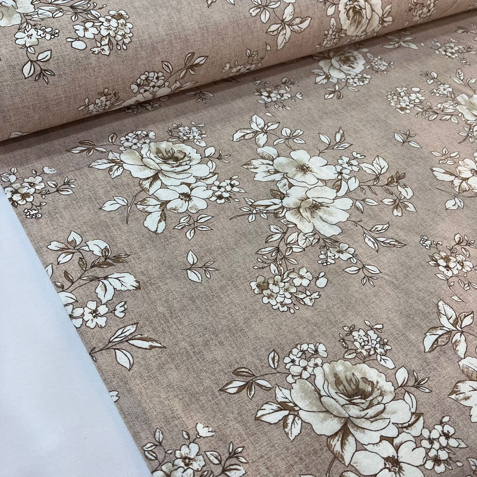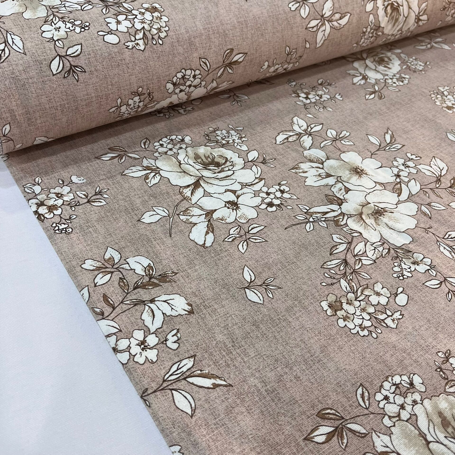 Pastel Kahve Güller Döşemelik Duck Keten Kumaş (en 215 cm)