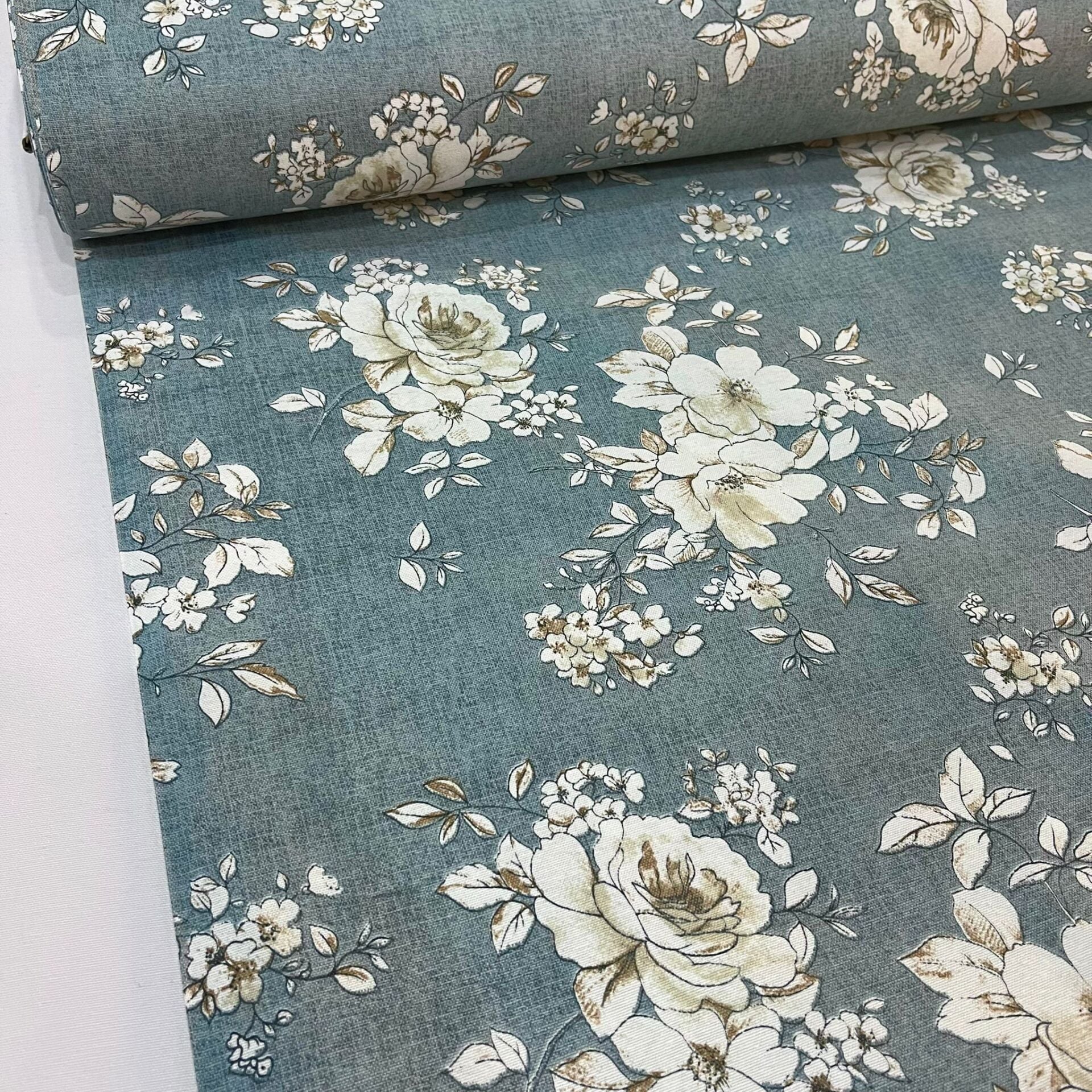 Pastel Mavi Güller Döşemelik Duck Keten Kumaş (en 215 cm)